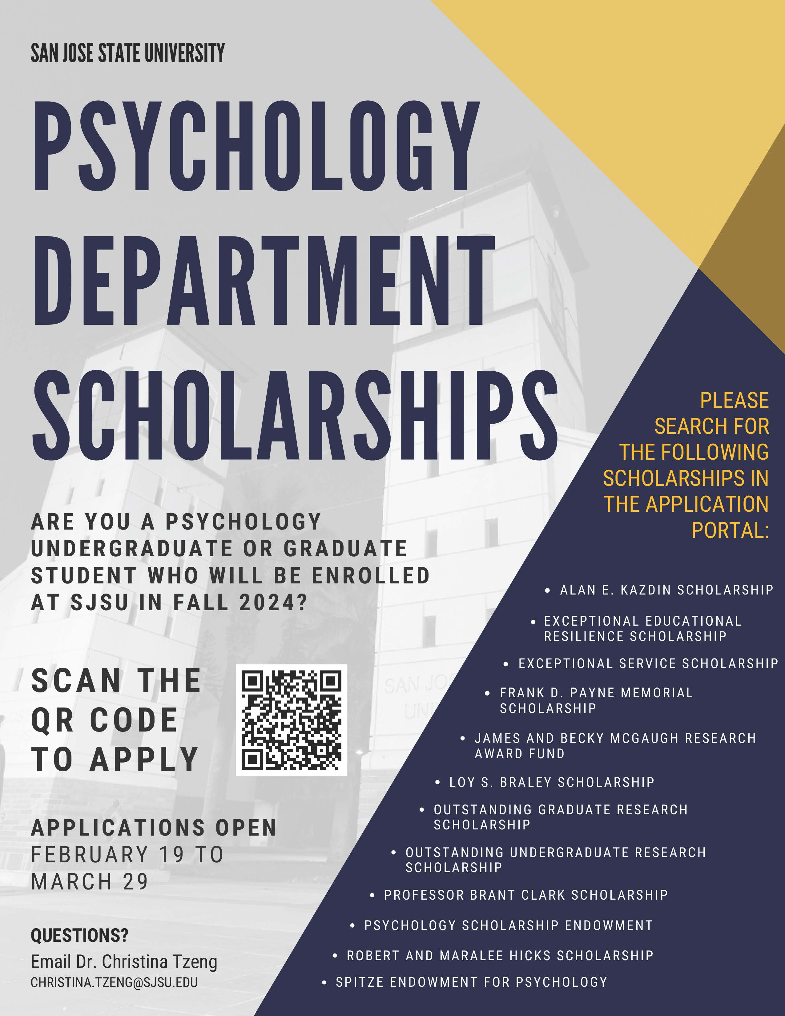 The Impact of Market Control cal grant for graduate school fafsa san jose state and related matters.. Funding | College of Graduate Studies. Meaningless in CSU and SJSU Funding Opportunities · Bertha Kalm Scholarship · CSU Chancellor’s Doctoral Incentive Program (CDIP) · CSU System-Wide Scholarships., Scholarships & Awards | Psychology, Scholarships & Awards | Psychology